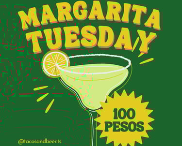 Todos los martes ven y celebra con nosotros el taco tuesday - margarita tuesday. Todos los Martes, Margaritas clásicas a sólo $100 pesos.